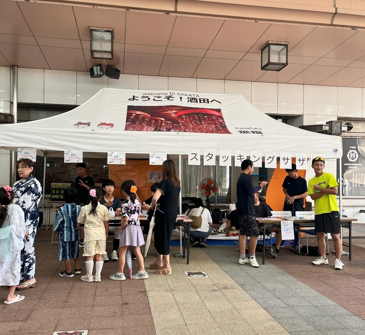 盆踊り会場では、射的やスタッキングさざえ(さざえの殻を積み上げるゲーム)の出店も!酒田市立第一中学校野球部の協力で来場者が楽しむことができる出店を行うことができました。