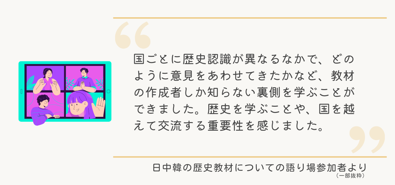 これまでに参加した若者たちからは、「定期的に対話の場を続けたい」「自分たちで企画して学びを深めたい」といった声が寄せられています。日韓関係の学生団体に加え、2025年度には一般参加者が企画した2つの「語り場」活動(さらなる理解を深めるための勉強会と語り合いの場)が行われています。