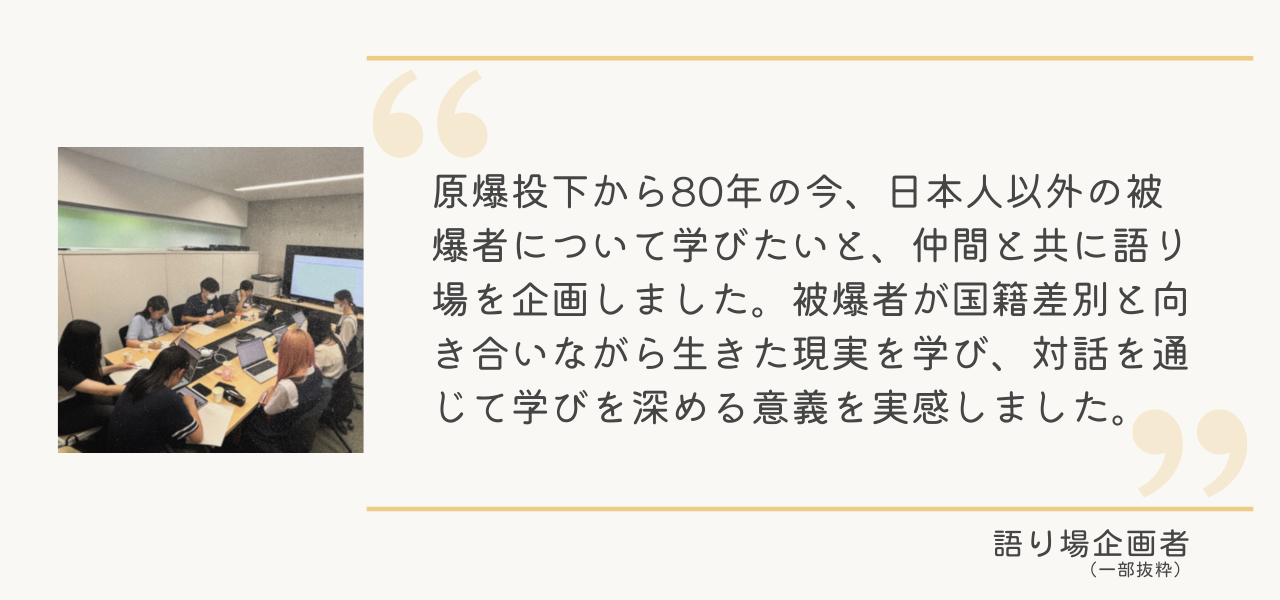 これらの活動に参加し、刺激を受けた人たちの自発的な提案と企画によって「日韓の被爆者の人生の軌跡」「生きづらさ」をテーマにした”語り場”活動が2025年度に始まりました。