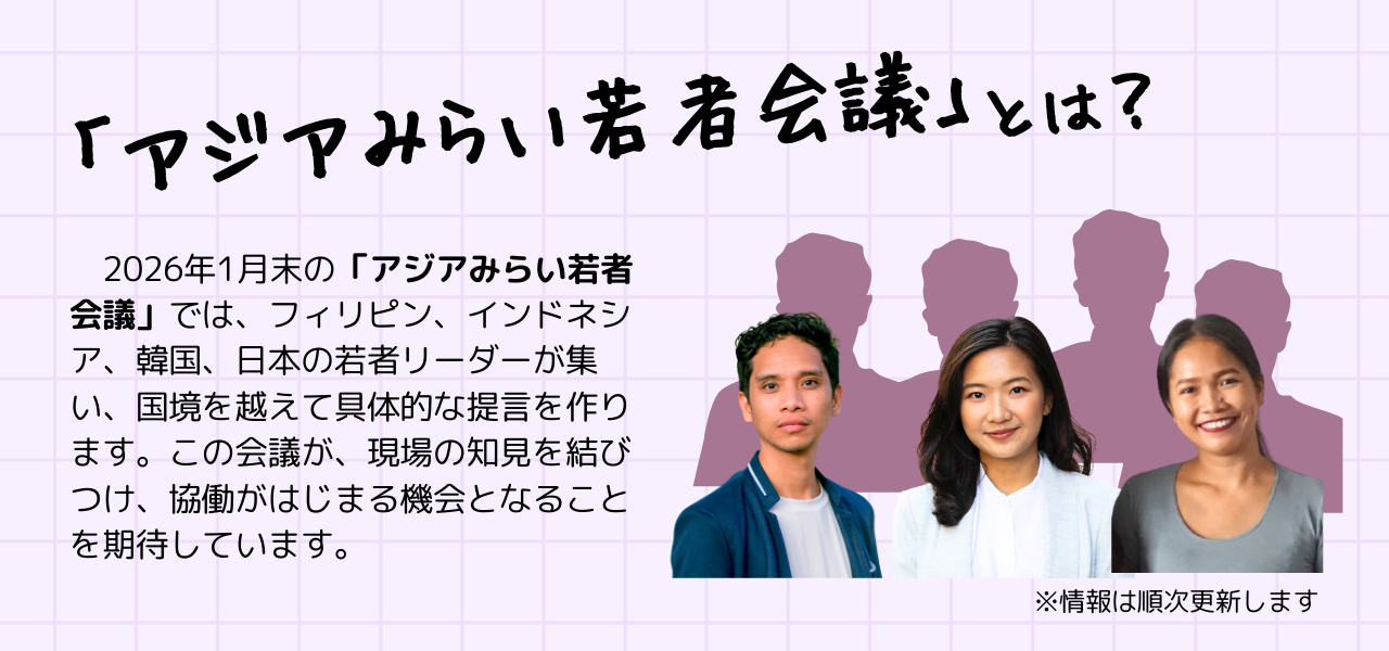 会議では、経済発展の一方で、環境問題や貧困、生きづらさなどの課題を抱えるフィリピン、インドネシア、韓国、日本の若者リーダーたちが集まり、共通課題や必要なリソースを話し合い、アジアの市民社会に向けた提言をまとめます。