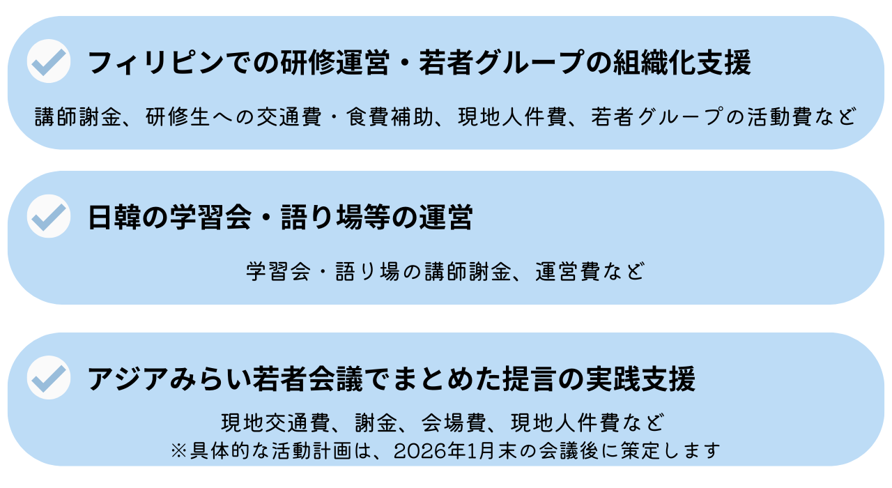 提言は2026年1月末に取りまとめ、ACC21の理事会で送金先や活動計画・予算について協議・承認を行ったうえで送金を実行します。なお、ACC21での直接支出またはチャイルドホープへの送金を通じて、「アジアみらい若者会議」で取りまとめた提言の実行のために活用する場合もあります。支援者の皆さまには、年次報告書等を通じてご報告いたします。