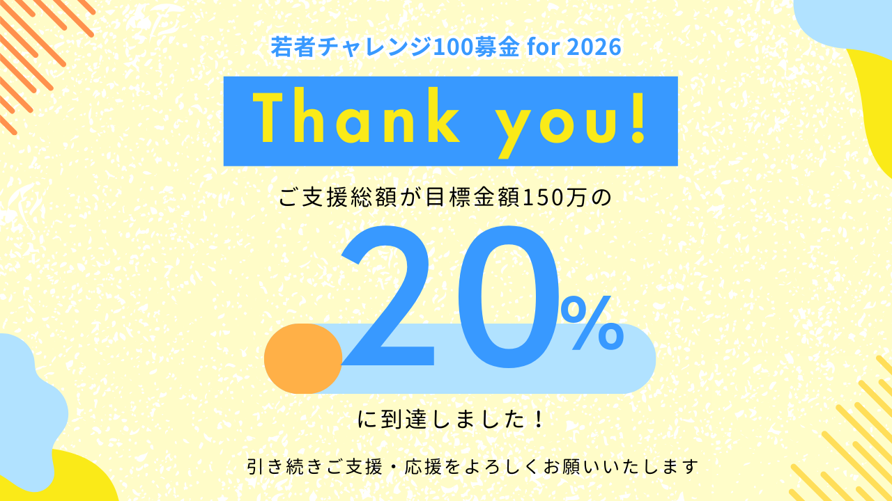 2025-12-17 18:00【若者チャレンジ100募金 for 2026】開始3日目で20%突破!「若者チャレンジ100募金 for 2026」に対し、これまでに15人の方から30万円を超えるご寄付をいただきました。温かいご支援、誠にありがとうございます! また、本募金を開始した12/15に、ACC21よりご案内をお送りしたところ、一部の方に同じ内容のメールが複数回届き、またその他の一部の方にはメール自体が届かないという事象が発生いたしました。 もし同一内容のメールが複数回届いておりましたら、大変ご迷惑をおかけしました。お詫び申し上げます。2025-12-17 18:00【若者チャレンジ100募金 for 2026】開始3日目で20%突破!「若者チャレンジ100募金 for 2026」に対し、これまでに15人の方から30万円を超えるご寄付をいただきました。温かいご支援、誠にありがとうございます! また、本募金を開始した12/15に、ACC21よりご案内をお送りしたところ、一部の方に同じ内容のメールが複数回届き、またその他の一部の方にはメール自体が届かないという事象が発生いたしました。 もし同一内容のメールが複数回届いておりましたら、大変ご迷惑をおかけしました。お詫び申し上げます。