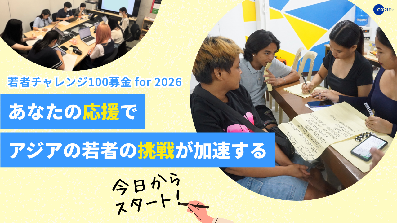 2026-01-17 10:00アジアの若者リーダーが東京に集結|「アジアみらい若者会議」が26日から始まります!「若者チャレンジ100募金 for 2026」に、これまでに51人の方から55万円を超えるご寄付をいただきました。温かいご支援、誠にありがとうございます! 本募金にいただいたご寄付は、フィリピンの若者の自立のためのチャレンジや、日韓の若者たちの対話と学び、そして10日後から始まる「アジアみらい若者会議」でつくる提言の実現のために活用させていただきます。 今日は、その「アジアみらい若者会議」についてご紹介させていただきます!2026-01-17 10:00アジアの若者リーダーが東京に集結|「アジアみらい若者会議」が26日から始まります!「若者チャレンジ100募金 for 2026」に、これまでに51人の方から55万円を超えるご寄付をいただきました。温かいご支援、誠にありがとうございます! 本募金にいただいたご寄付は、フィリピンの若者の自立のためのチャレンジや、日韓の若者たちの対話と学び、そして10日後から始まる「アジアみらい若者会議」でつくる提言の実現のために活用させていただきます。 今日は、その「アジアみらい若者会議」についてご紹介させていただきます!