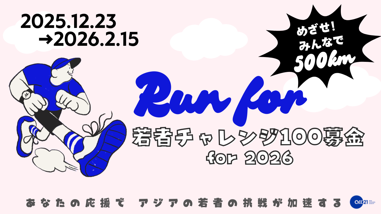 2025-12-23 10:30一緒に走って応援しよう!「若者チャレンジ100募金 #応援ラン」に参加しませんか?こんにちは! 「若者チャレンジ100募金に温かいご支援をいただき、ありがとうございます。 このクラウドファンディング「若者チャレンジ100募金 for 2026」を前進させるため、期間限定の応援ランを本日・12月23日からスタートしました。 みんなで合計500kmを走ることを目指しながら、ランニングでつながり、アジアの若者たちの挑戦を応援しませんか?2025-12-23 10:30一緒に走って応援しよう!「若者チャレンジ100募金 #応援ラン」に参加しませんか?こんにちは! 「若者チャレンジ100募金に温かいご支援をいただき、ありがとうございます。 このクラウドファンディング「若者チャレンジ100募金 for 2026」を前進させるため、期間限定の応援ランを本日・12月23日からスタートしました。 みんなで合計500kmを走ることを目指しながら、ランニングでつながり、アジアの若者たちの挑戦を応援しませんか?
