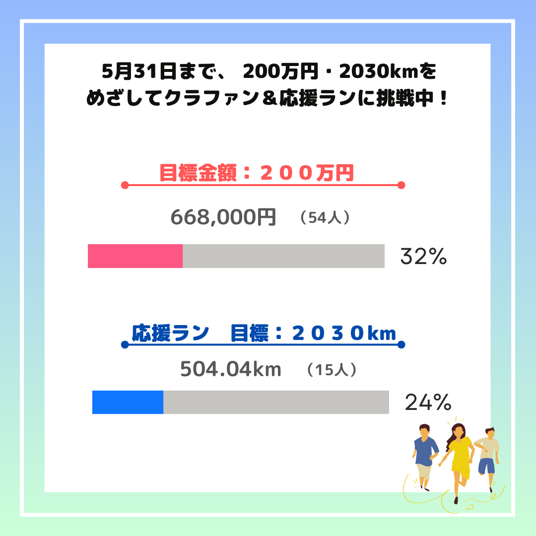 このクラウドファンディングと並行して呼び掛けている「2030kmランニング」の応援ランではなんと、500kmに到達しました!ラン&ウォークでご参加いただいている皆さま、本当にありがとうございます!