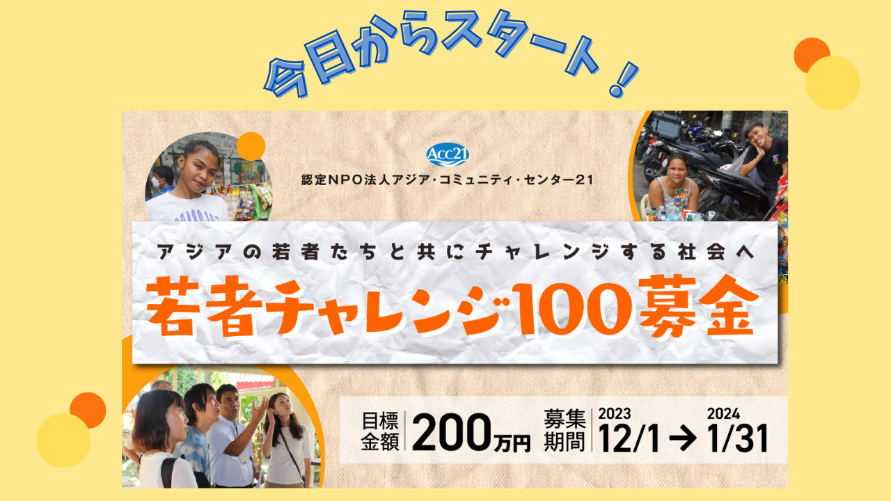 ACC21は、アジアの若者たちと共に100のチャレンジをつくる「若者チャレンジ100募金」を12月1日からスタートしました。来年1月末まで200万円の達成を目標に、アジアの若者たちと100のチャレンジをつくり出し、実施していくための活動資金を募ります。