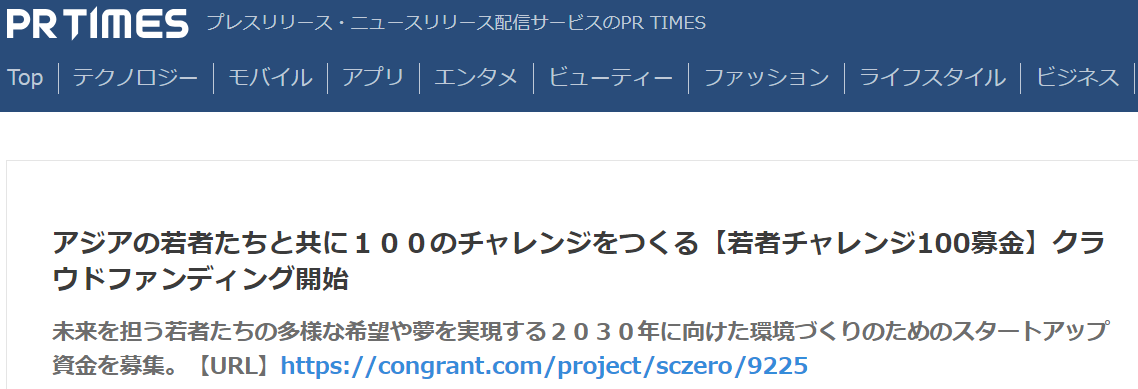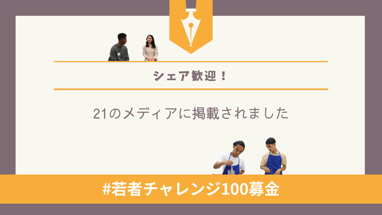 PR TIMESに「若者チャレンジ100募金」のプレスリリースを掲載しました。現在までに、そのリリースを21のメディアに掲載していただきました。お気に入りのメディアがありましたらぜひご覧いただき、FacebookやXなどのSNSでシェアしていただけると嬉しいです。