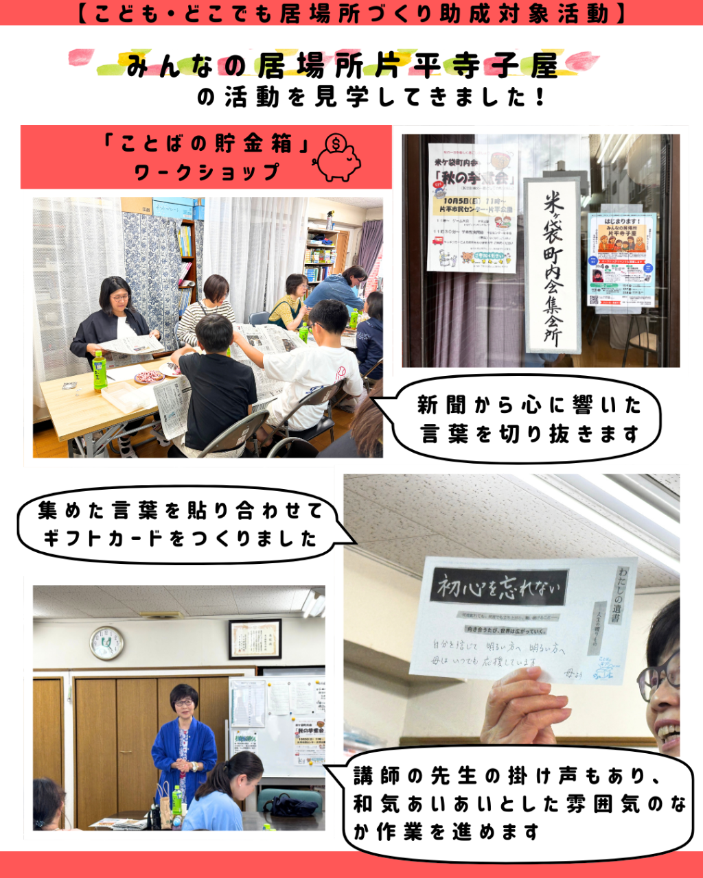 この日は、新聞から好きな言葉を見つけてギフトカード作りを楽しむ「ことばの貯金箱」ワークショップが行われました。