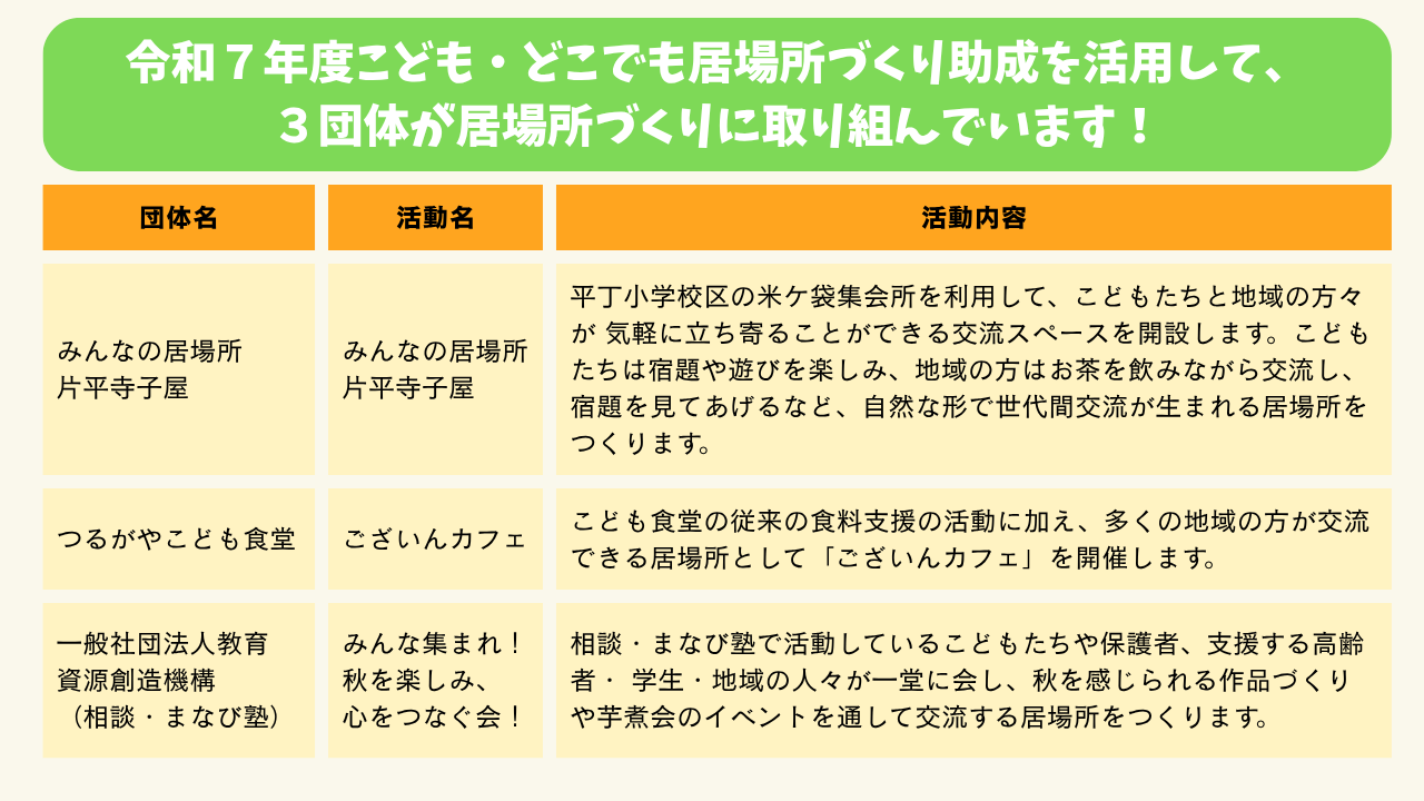 2025-12-25 10:12こども・どこでも居場所づくり助成の助成団体が決定しました!こども・若者の居場所づくりに取り組む3団体に、令和7年度こども・どこでも居場所づくり助成金の交付を決定しました。各団体では、多世代交流型のこどもの居場所づくりを新たにスタートさせています!今後、各団体の活動の様子についても、随時ご紹介させていただきます。 この助成金は、仙台こども財団を応援してくださるみなさまからいただいた寄附等により支えられています。 皆さまの思いが、こどもたちが安心して過ごし、多世代とつながることができる「居場所づくり」の支援につながります。 これからも地域の居場所づくりの取組を応援していただけますと幸いです。2025-12-25 10:12こども・どこでも居場所づくり助成の助成団体が決定しました!こども・若者の居場所づくりに取り組む3団体に、令和7年度こども・どこでも居場所づくり助成金の交付を決定しました。各団体では、多世代交流型のこどもの居場所づくりを新たにスタートさせています!今後、各団体の活動の様子についても、随時ご紹介させていただきます。 この助成金は、仙台こども財団を応援してくださるみなさまからいただいた寄附等により支えられています。 皆さまの思いが、こどもたちが安心して過ごし、多世代とつながることができる「居場所づくり」の支援につながります。 これからも地域の居場所づくりの取組を応援していただけますと幸いです。