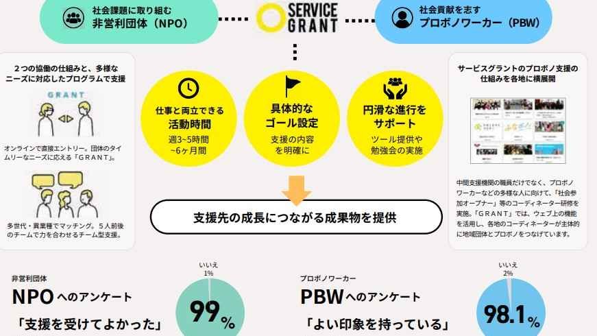 2026-02-20 11:40社会課題を前に、互いの⽴場や違いを尊重しながら、 当たり前のように協働できる社会を⽬指してサービスグラントの《プロボノ》と《プロジェクト型協働》 仕事で培った経験やスキルを活かした社会貢献活動「プロボノ」。その仕組みを⽇本に持ち帰り、活動をスタートしてから20年が経ちました。複雑な課題を抱える団体と、外部の多様な⼈との協働を成功させるうえでカギとなるのは、「プロジェクト型協働」。サービスグラントでは、⽇本に合ったよりよい仕組みをつくるために、改善と新たな取り組みの試⾏を繰り返しています。その結果、「プロボノ」は、社会課題解決に成果をもたらす⼿法として、また社会参加の機会として、着実に広がり続けています。2026-02-20 11:40社会課題を前に、互いの⽴場や違いを尊重しながら、 当たり前のように協働できる社会を⽬指してサービスグラントの《プロボノ》と《プロジェクト型協働》 仕事で培った経験やスキルを活かした社会貢献活動「プロボノ」。その仕組みを⽇本に持ち帰り、活動をスタートしてから20年が経ちました。複雑な課題を抱える団体と、外部の多様な⼈との協働を成功させるうえでカギとなるのは、「プロジェクト型協働」。サービスグラントでは、⽇本に合ったよりよい仕組みをつくるために、改善と新たな取り組みの試⾏を繰り返しています。その結果、「プロボノ」は、社会課題解決に成果をもたらす⼿法として、また社会参加の機会として、着実に広がり続けています。