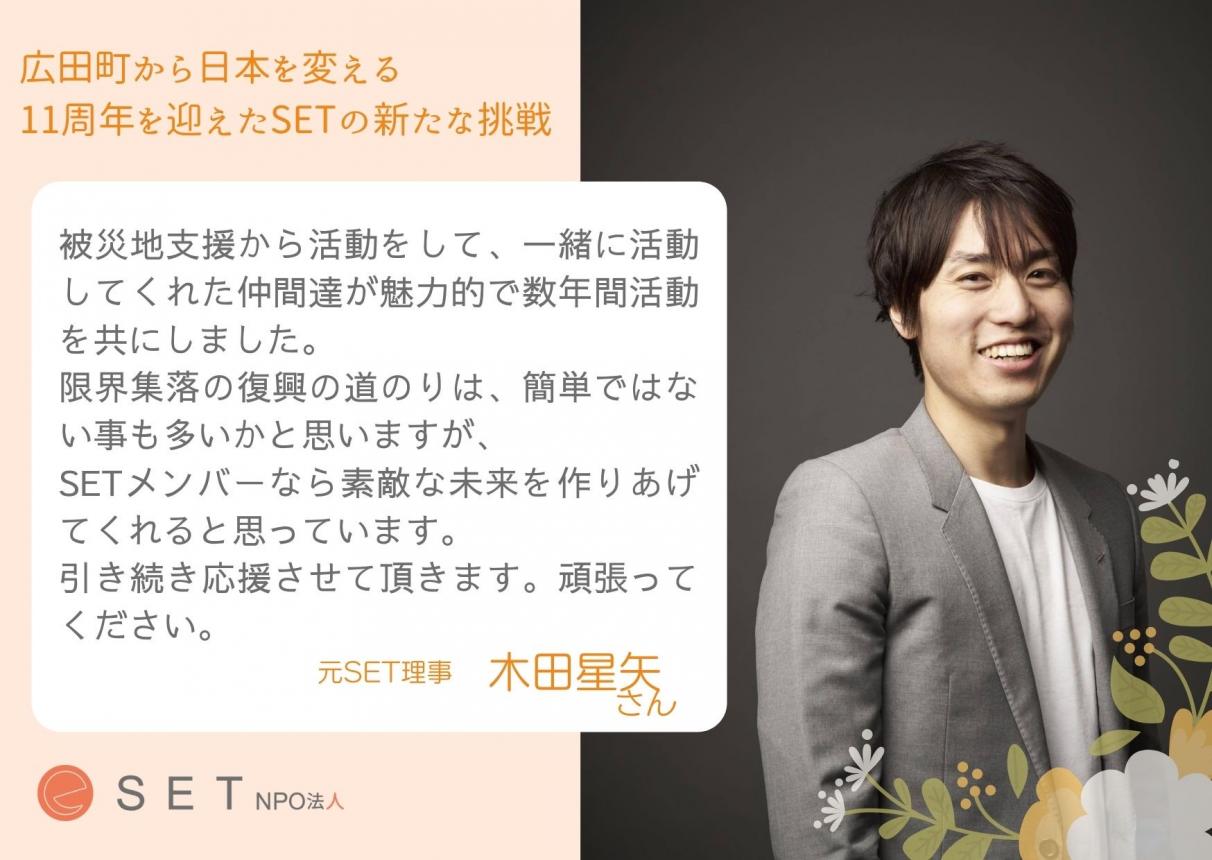 2022-03-12 10:48【SET11周年イベント、YoutubeLIVEでの開催が決定!】【YoutubeLIVEでの開催決定!】 NPO法人SET設立11周年記念イベント ~広田町から日本を変える 11周年を迎えたSETの新たな挑戦~ 明日3月13日(日)15:00~16:00開催予定の11周年イベントを、より多くの皆様に視聴いただくためにYoutubeLIVEでの同時公開を決定いたしました。 ▶️YoutubeLIVE参加用URL https://youtu.be/FSsQ9xCs-w0 当日こちらのURLから入室いただくと、設定等をせずに簡単にご参加いただけます。 ぜひ、ご参加ください!2022-03-12 10:48【SET11周年イベント、YoutubeLIVEでの開催が決定!】【YoutubeLIVEでの開催決定!】 NPO法人SET設立11周年記念イベント ~広田町から日本を変える 11周年を迎えたSETの新たな挑戦~ 明日3月13日(日)15:00~16:00開催予定の11周年イベントを、より多くの皆様に視聴いただくためにYoutubeLIVEでの同時公開を決定いたしました。 ▶️YoutubeLIVE参加用URL https://youtu.be/FSsQ9xCs-w0 当日こちらのURLから入室いただくと、設定等をせずに簡単にご参加いただけます。 ぜひ、ご参加ください!