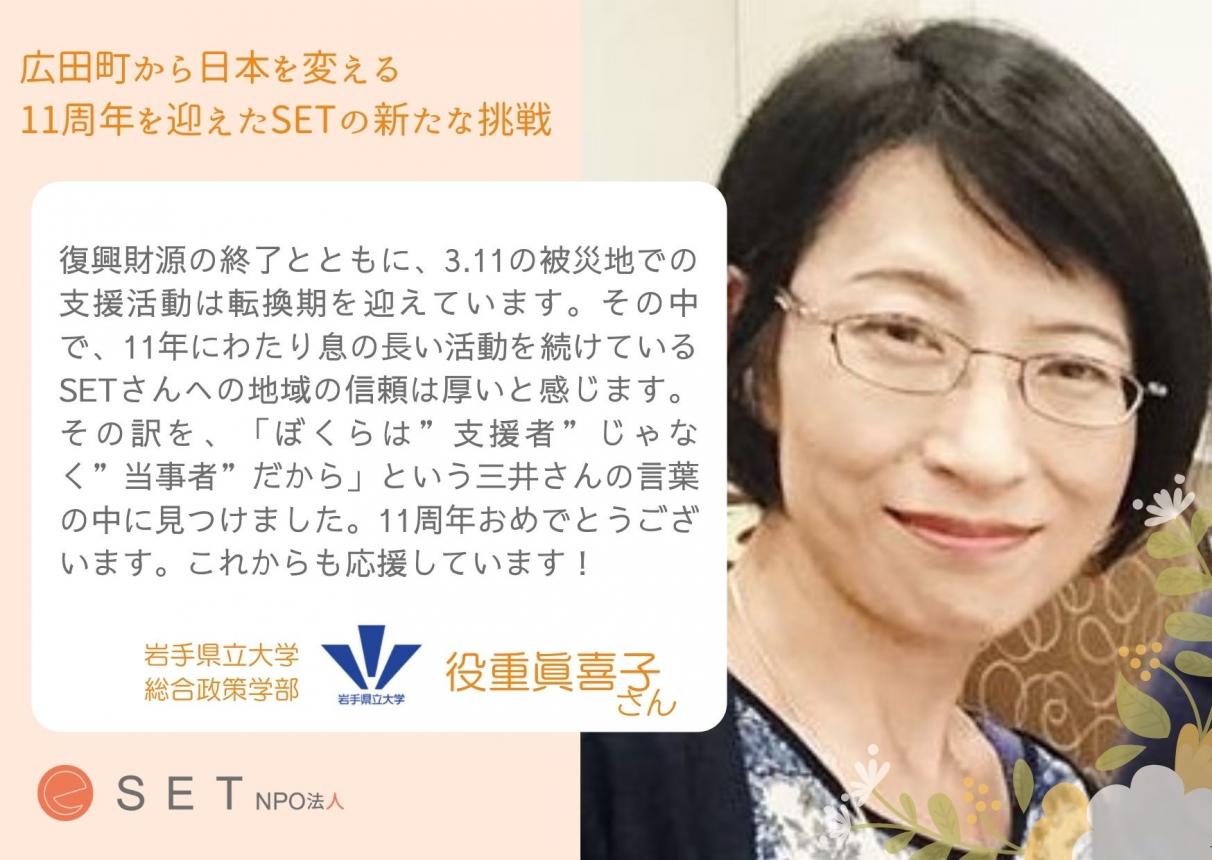 岩手県立大学 総合政策学部 役重眞喜子さんより応援メッセージをいただいております! 本当にありがとうございます!