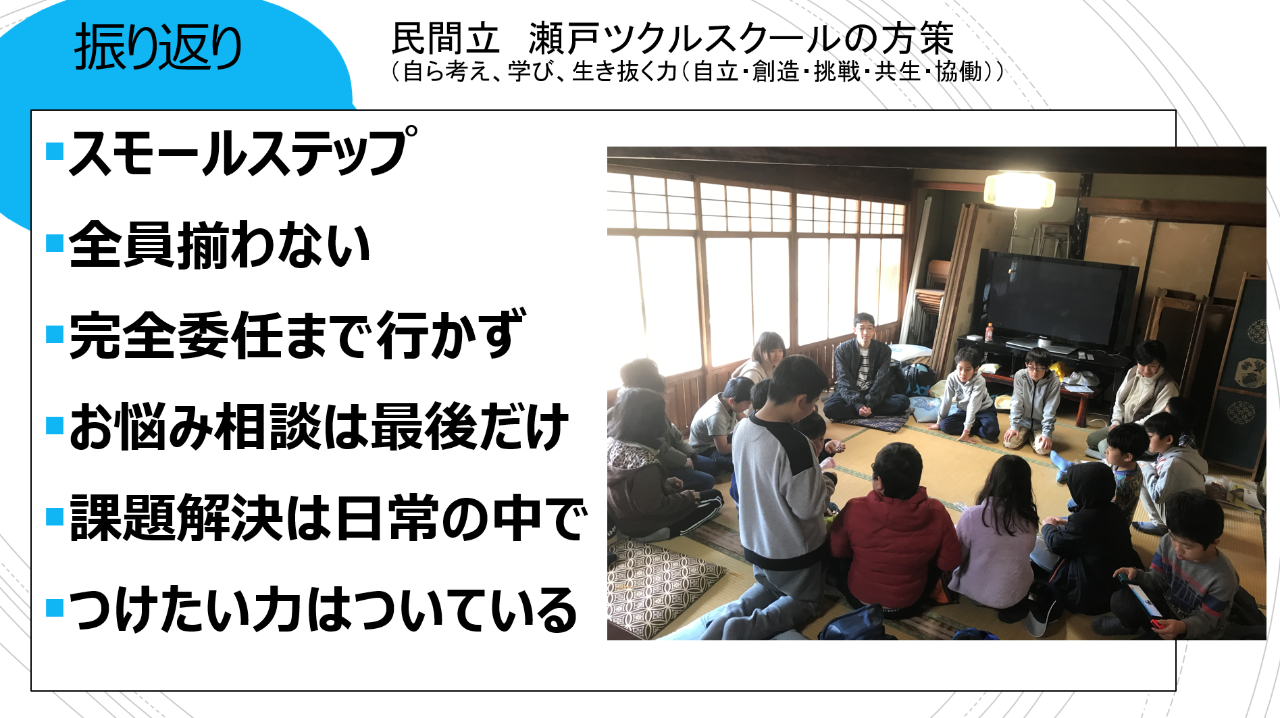 ただし、そのためには「時間」が必要でした。瀬戸ツクルスクールには時間の余裕があり、じっくり話し合ったり、一人で考える時間が持てます。そのおかげで、自然と問題が解決していくことが多かったのです。