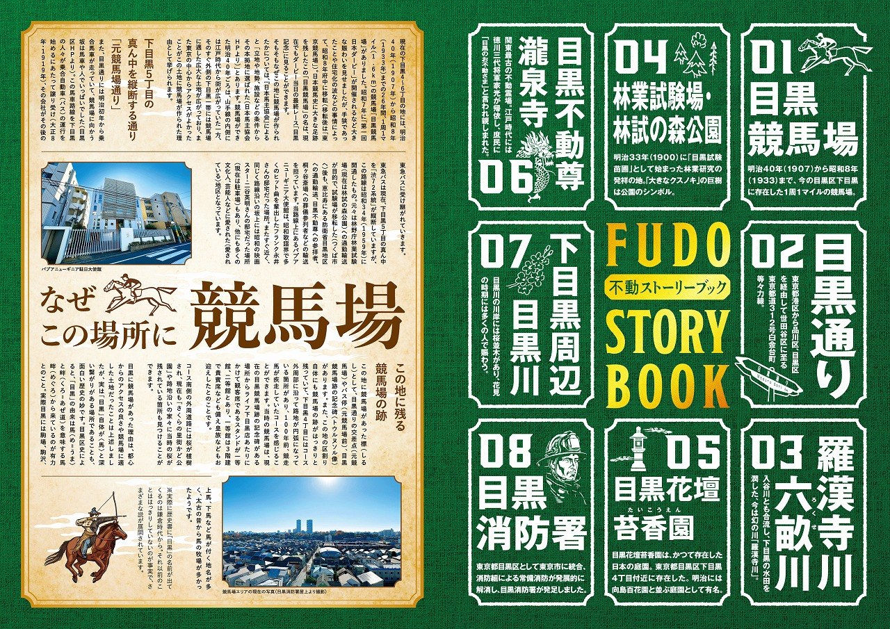 また、目黒競馬場(明治40年開設、昭和8年に府中へ移転、現在の東京競馬場)の跡地としての歴史や目黒不動尊、五百羅漢寺、大鳥神社等の寺院神社を身近に感じる土地柄です。まちの歴史は「不動ストーリーブック(令和6年1月制作)」としてまとめています。