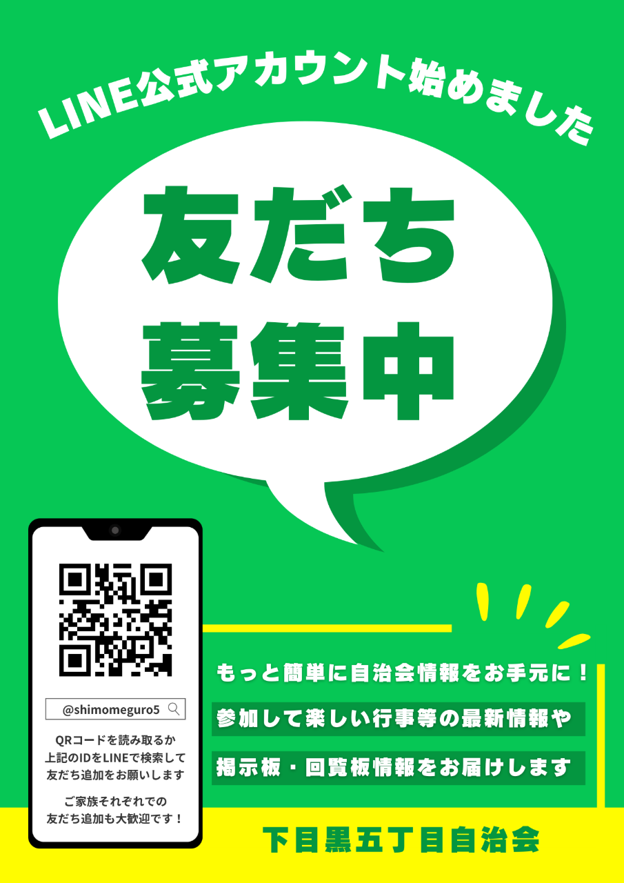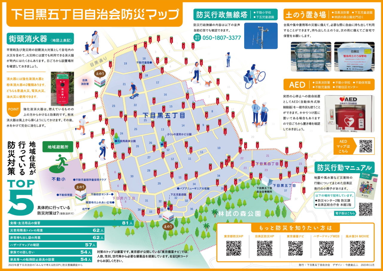 下五自治会の対象区域は、下目黒5丁目の大部分(下目黒5丁目6番一部、7番一部、8番~36番、37番一部)と下目黒4丁目の一部(下目黒4丁目21番~23番)および下目黒6丁目の一部(下目黒6丁目6番、8番一部)になります。自治会事務所は、下目黒5丁目37番5号に置かれています。