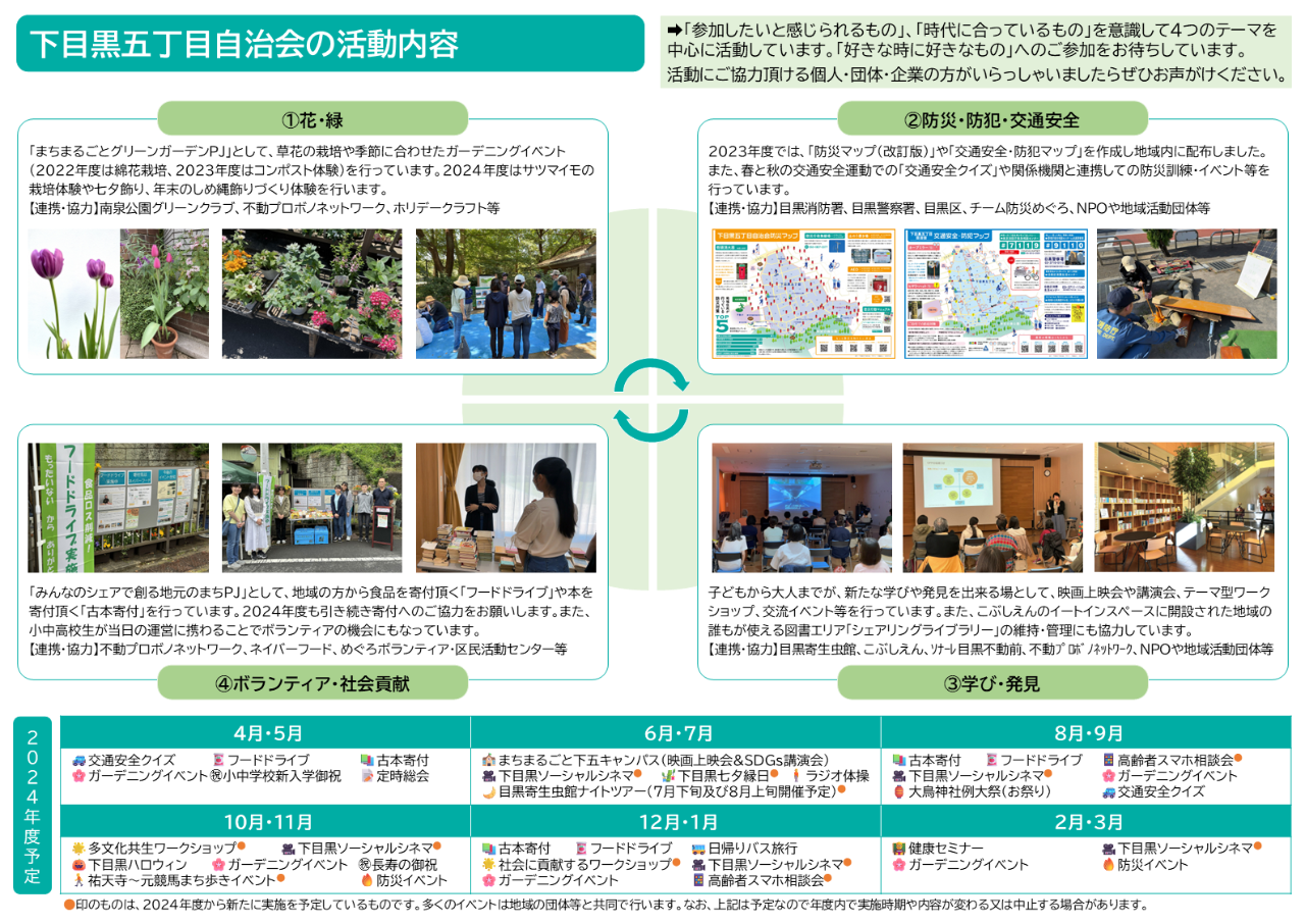 会費は、各部が行う防災活動や防犯活動、交通安全、お祝い、広報等の事業及びプロジェクト活動(まちまるごとグリーンガーデンプロジェクトやみんなのシェアで創る地元のまちプロジェクト等)に使わせていただきます。