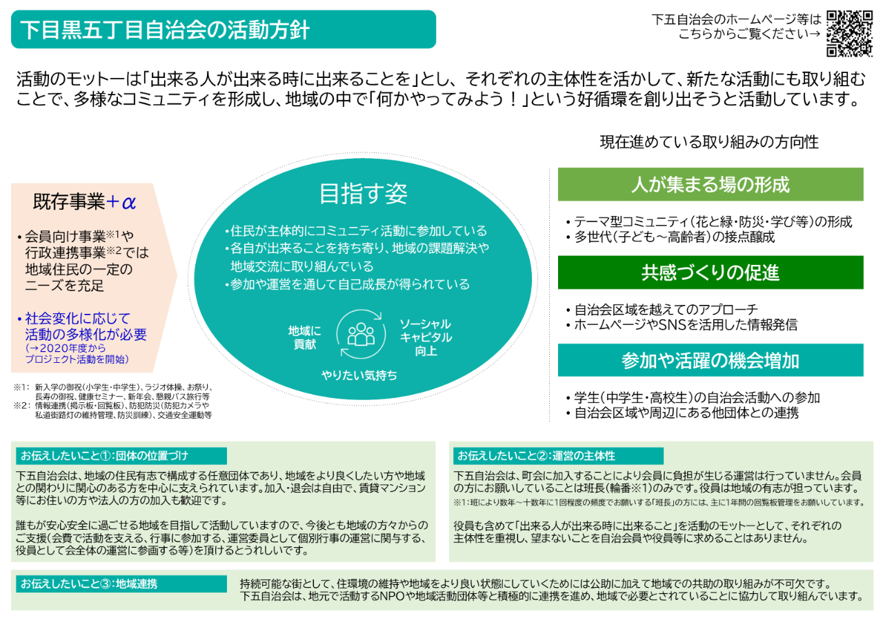 下五自治会では、活動のモットーを「出来る人が出来る時に出来ることを」として、地域住民の主体性を重視し、望まないことを自治会員や自治会役員等に求めることはありません。逆に、やりたいことを応援し、新たな活動にも取り組むことで、多様なコミュニティを形成し、地域の中で「何かやってみよう!」という好循環を創り出そうと活動しています。ぜひご協力とご支援をお願いします。