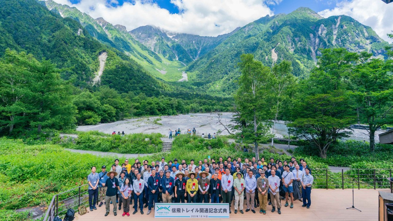2025-08-29 22:45信飛トレイル開通記念式典を開催しました!7月14日、上高地の白樺荘にて、松本市と高山市を結ぶ全長117kmの「信飛トレイル」の開通記念式典を開催しました。会場には両市長をはじめ、環境省や観光協会、山小屋関係者、賛助会員など多くの方々が集まり、地域をつなぐ新たな道の誕生を祝いました。 式典では、松本市長と高山市副市長が各市の始終点から上高地へ向けて地名パネルを貼り進め、最後に環境省所長と握手を交わすセレモニーを実施。両市を結ぶ道の完成を象徴する場面となりました。 また、国内外のロングトレイルに詳しい土屋智哉氏(ハイカーズデポ代表)と理事・勝俣隆氏による講演では、「歩く旅」の魅力や地域資源の活かし方について語られ、参加者は登山とは異なるロングトレイルの価値を再認識しました。 式典後の懇親会では関係者同士の交流が深まり、信飛トレイルが地域と人をつなぐ新しい舞台として大きな期待を集める門出となりました。2025-08-29 22:45信飛トレイル開通記念式典を開催しました!7月14日、上高地の白樺荘にて、松本市と高山市を結ぶ全長117kmの「信飛トレイル」の開通記念式典を開催しました。会場には両市長をはじめ、環境省や観光協会、山小屋関係者、賛助会員など多くの方々が集まり、地域をつなぐ新たな道の誕生を祝いました。 式典では、松本市長と高山市副市長が各市の始終点から上高地へ向けて地名パネルを貼り進め、最後に環境省所長と握手を交わすセレモニーを実施。両市を結ぶ道の完成を象徴する場面となりました。 また、国内外のロングトレイルに詳しい土屋智哉氏(ハイカーズデポ代表)と理事・勝俣隆氏による講演では、「歩く旅」の魅力や地域資源の活かし方について語られ、参加者は登山とは異なるロングトレイルの価値を再認識しました。 式典後の懇親会では関係者同士の交流が深まり、信飛トレイルが地域と人をつなぐ新しい舞台として大きな期待を集める門出となりました。