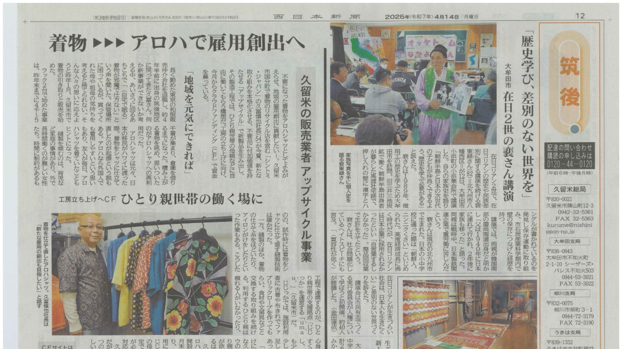 「ひとり親ママたちが働くことができるきものリメイク工房を設立したい」プロジェクトを応援いただきありがとうございます。 本日の西日本新聞朝刊に記事が掲載されました。 「記事読みました。応援しています」というとても嬉しいお電話いただきました!残り47日最後の一日までやりきりたいと思います。 引き続き応援よろしくお願い申し上げます。