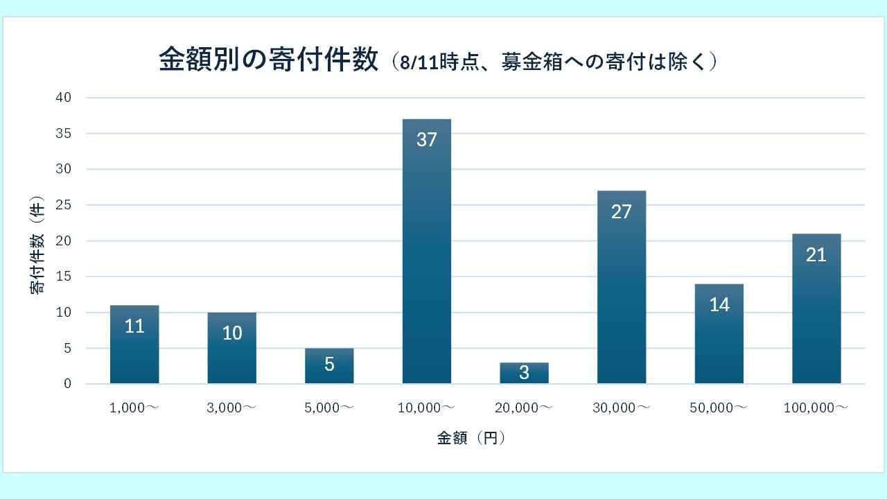 2024-08-13 19:28寄付の件数について(8/11時点)ご寄付の金額を迷われている方から「みなさん、どれくらいの額を寄付されているの?」との質問をいただくことがあります。そのような方のご参考に、金額別の件数をお知らせいたします(8/11時点の集計)。寄付システムでは1,000円単位でご寄付いただけることも意外と知られていないようなので、改めて周知させていただきます。 「システムはちょっと(苦手・・)」という方には、「8/17(土) 緑丘自治会ぼんおどり」や「9/14(土) 敬老の集い」など、地域団体主催のイベントに寄付ブースを設置しております。宜しくお願いいたしますm(__)m2024-08-13 19:28寄付の件数について(8/11時点)ご寄付の金額を迷われている方から「みなさん、どれくらいの額を寄付されているの?」との質問をいただくことがあります。そのような方のご参考に、金額別の件数をお知らせいたします(8/11時点の集計)。寄付システムでは1,000円単位でご寄付いただけることも意外と知られていないようなので、改めて周知させていただきます。 「システムはちょっと(苦手・・)」という方には、「8/17(土) 緑丘自治会ぼんおどり」や「9/14(土) 敬老の集い」など、地域団体主催のイベントに寄付ブースを設置しております。宜しくお願いいたしますm(__)m