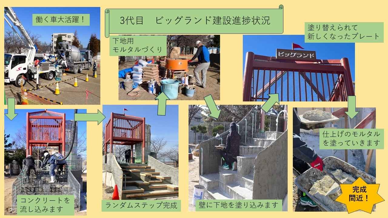 2025-02-12 16:133代目ビッグランド 建設進捗状況 第2・3弾第1弾からはや10日あまり…。来週のお披露目会に向けてビッグランドの建設も急ピッチで進んでいます。どんどん造られていくビッグランドに子どもたちも「早く遊びた~い」と胸を高鳴らせているのではないでしょうか?公式インスタグラムではこちらに紹介出来なかった写真を織り交ぜたリール動画を配信しております。ぜひインスタグラムもご覧ください。フォローもよろしくお願いします。 第2弾→https://www.instagram.com/reel/DF1-zu-h_SI/?igsh=bWpkOW10Nm1oNjFn 第3弾→https://www.instagram.com/reel/DF9sXLRh2Q-/?igsh=OGU4ZjBkYmNpY25m2025-02-12 16:133代目ビッグランド 建設進捗状況 第2・3弾第1弾からはや10日あまり…。来週のお披露目会に向けてビッグランドの建設も急ピッチで進んでいます。どんどん造られていくビッグランドに子どもたちも「早く遊びた~い」と胸を高鳴らせているのではないでしょうか?公式インスタグラムではこちらに紹介出来なかった写真を織り交ぜたリール動画を配信しております。ぜひインスタグラムもご覧ください。フォローもよろしくお願いします。 第2弾→https://www.instagram.com/reel/DF1-zu-h_SI/?igsh=bWpkOW10Nm1oNjFn 第3弾→https://www.instagram.com/reel/DF9sXLRh2Q-/?igsh=OGU4ZjBkYmNpY25m