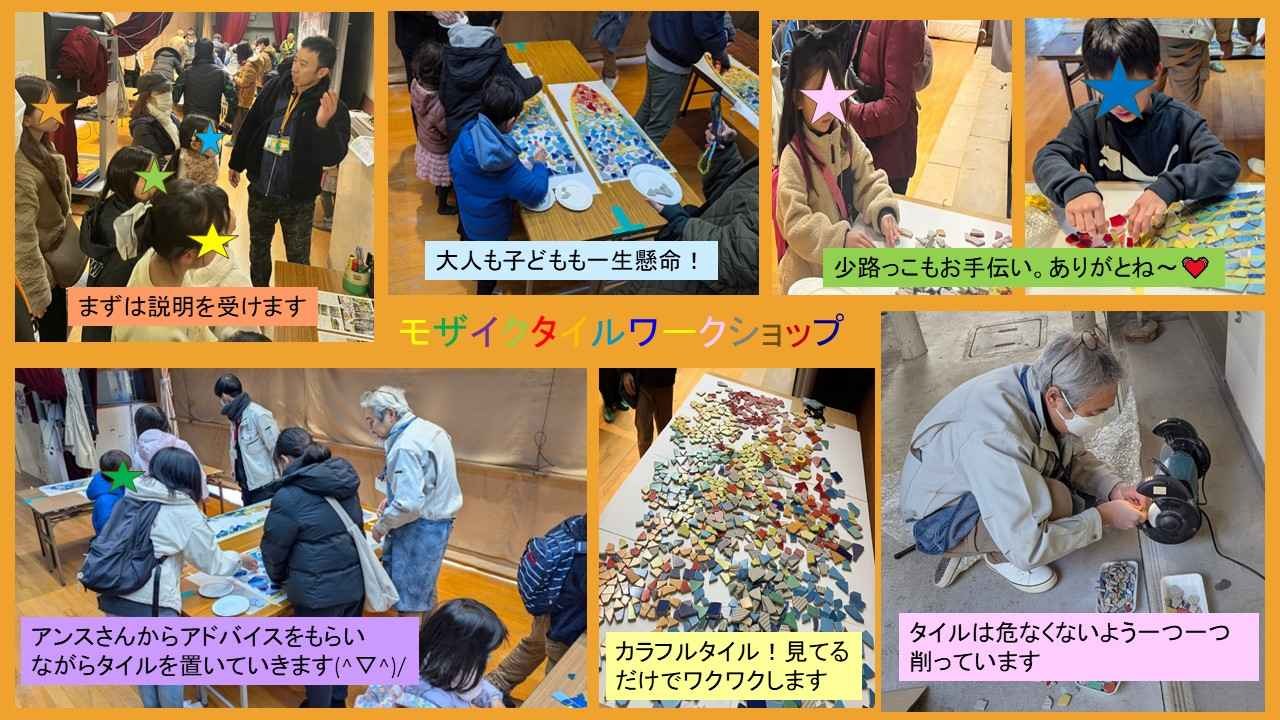 2025-01-19 14:45モザイクタイルワークショップを開催しました!令和7年1月11日(土)、運動場ではお餅つき、和太鼓演奏、アメフト子ども教室が、体育館フロアではかるた大会が開催されている中、緞帳(どんちょう)の下りた体育館舞台上ではモザイクタイルワークショップが行われていました!少路小学校の校章となっている竹、その竹の子どもであるたけのこをモチーフにデザインされていること、モザイクアートは数十年もつので子ども達が大人になっても残っていることなどの説明を受け、いよいよタイルアートに臨みます。カラフルなタイルを見ただけで『わあ~』と歓喜の声も~(^▽^)/カラフルな色は、校歌にある太陽、空、雲から想起される『虹🌈』をイメージしています。新ビッグランドの製作に携われる唯一の機会とあって、400人を超える皆さまにご参加頂きました。誠にありがとうございました。2025-01-19 14:45モザイクタイルワークショップを開催しました!令和7年1月11日(土)、運動場ではお餅つき、和太鼓演奏、アメフト子ども教室が、体育館フロアではかるた大会が開催されている中、緞帳(どんちょう)の下りた体育館舞台上ではモザイクタイルワークショップが行われていました!少路小学校の校章となっている竹、その竹の子どもであるたけのこをモチーフにデザインされていること、モザイクアートは数十年もつので子ども達が大人になっても残っていることなどの説明を受け、いよいよタイルアートに臨みます。カラフルなタイルを見ただけで『わあ~』と歓喜の声も~(^▽^)/カラフルな色は、校歌にある太陽、空、雲から想起される『虹🌈』をイメージしています。新ビッグランドの製作に携われる唯一の機会とあって、400人を超える皆さまにご参加頂きました。誠にありがとうございました。