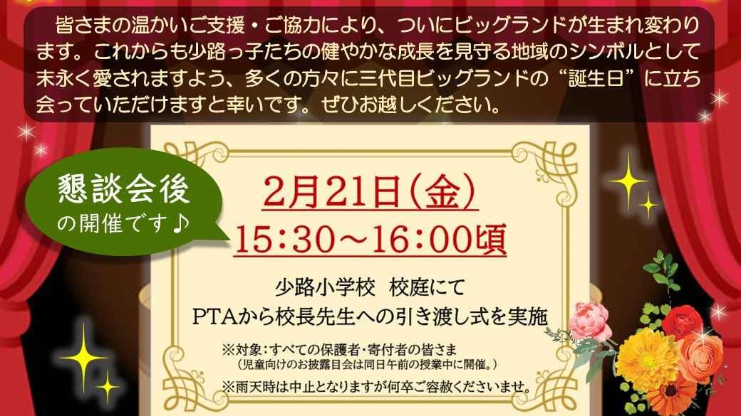 2025-02-12 16:26新ビッグランド お披露目会のお知らせ皆さまの温かいご支援・ご協力により、ついにビッグランドが生まれ変わります。これからも少路っ子たちの健やかな成長を見守る地域のシンボルとして末永く愛されますよう、多くの方々に三代目ビッグランドの『誕生日』に立ち会っていただけますと幸いです。ぜひお越しください。2025-02-12 16:26新ビッグランド お披露目会のお知らせ皆さまの温かいご支援・ご協力により、ついにビッグランドが生まれ変わります。これからも少路っ子たちの健やかな成長を見守る地域のシンボルとして末永く愛されますよう、多くの方々に三代目ビッグランドの『誕生日』に立ち会っていただけますと幸いです。ぜひお越しください。