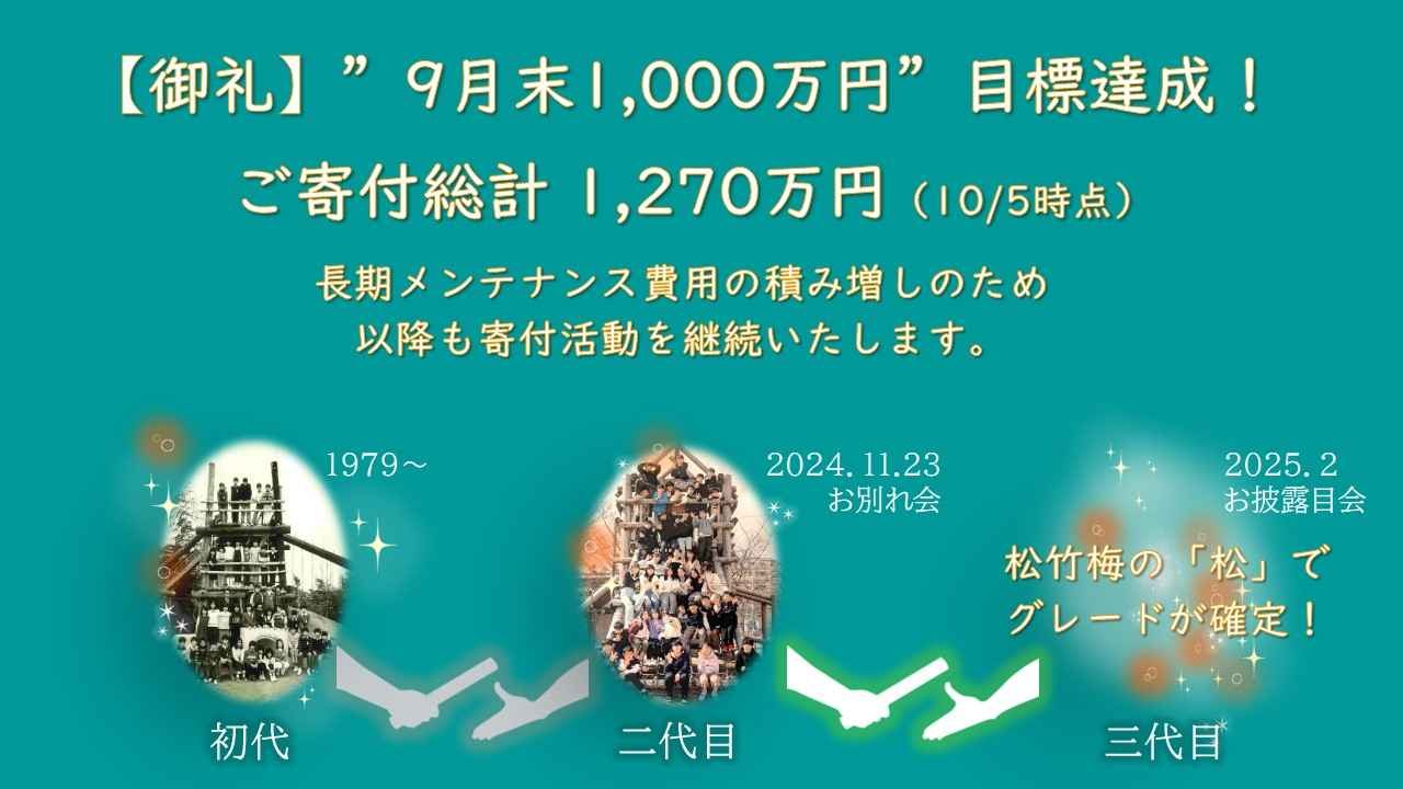 2024-10-06 00:25【御礼】ネクストゴール1000万到達!!誠にありがとうございます!6月より寄付活動を始めて4か月、ビックランド基金1000万を超えることが出来ました!! 遊具グレードは松竹梅の『松』が確定となり、夢の遊具設置へまた一歩近づくことができました。 これもひとえに皆様のご支援のおかげです。誠にありがとうございました。 これまで頂いた寄付金は遊具の購入や将来のメンテナンス費用の積み立てに充てられ、更なるメンテナンス費用の積み増しのため、2025年3月まで寄付活動が続きます。引き続きのご支援を宜しくお願いいたします。また活動報告での各種お知らせも継続しますのでご注目下さい。 早速ですが、11月23日(土)の午前中に、ビックランドのお別れ会が開催されます。 プレミアムチケット(バルーンリリース+記念品)をお持ちでない方も、お別れ会にはご参加いただけますので(入場は無料)どなた様もぜひお越しください!!詳細は近日中に公開いたします。2024-10-06 00:25【御礼】ネクストゴール1000万到達!!誠にありがとうございます!6月より寄付活動を始めて4か月、ビックランド基金1000万を超えることが出来ました!! 遊具グレードは松竹梅の『松』が確定となり、夢の遊具設置へまた一歩近づくことができました。 これもひとえに皆様のご支援のおかげです。誠にありがとうございました。 これまで頂いた寄付金は遊具の購入や将来のメンテナンス費用の積み立てに充てられ、更なるメンテナンス費用の積み増しのため、2025年3月まで寄付活動が続きます。引き続きのご支援を宜しくお願いいたします。また活動報告での各種お知らせも継続しますのでご注目下さい。 早速ですが、11月23日(土)の午前中に、ビックランドのお別れ会が開催されます。 プレミアムチケット(バルーンリリース+記念品)をお持ちでない方も、お別れ会にはご参加いただけますので(入場は無料)どなた様もぜひお越しください!!詳細は近日中に公開いたします。