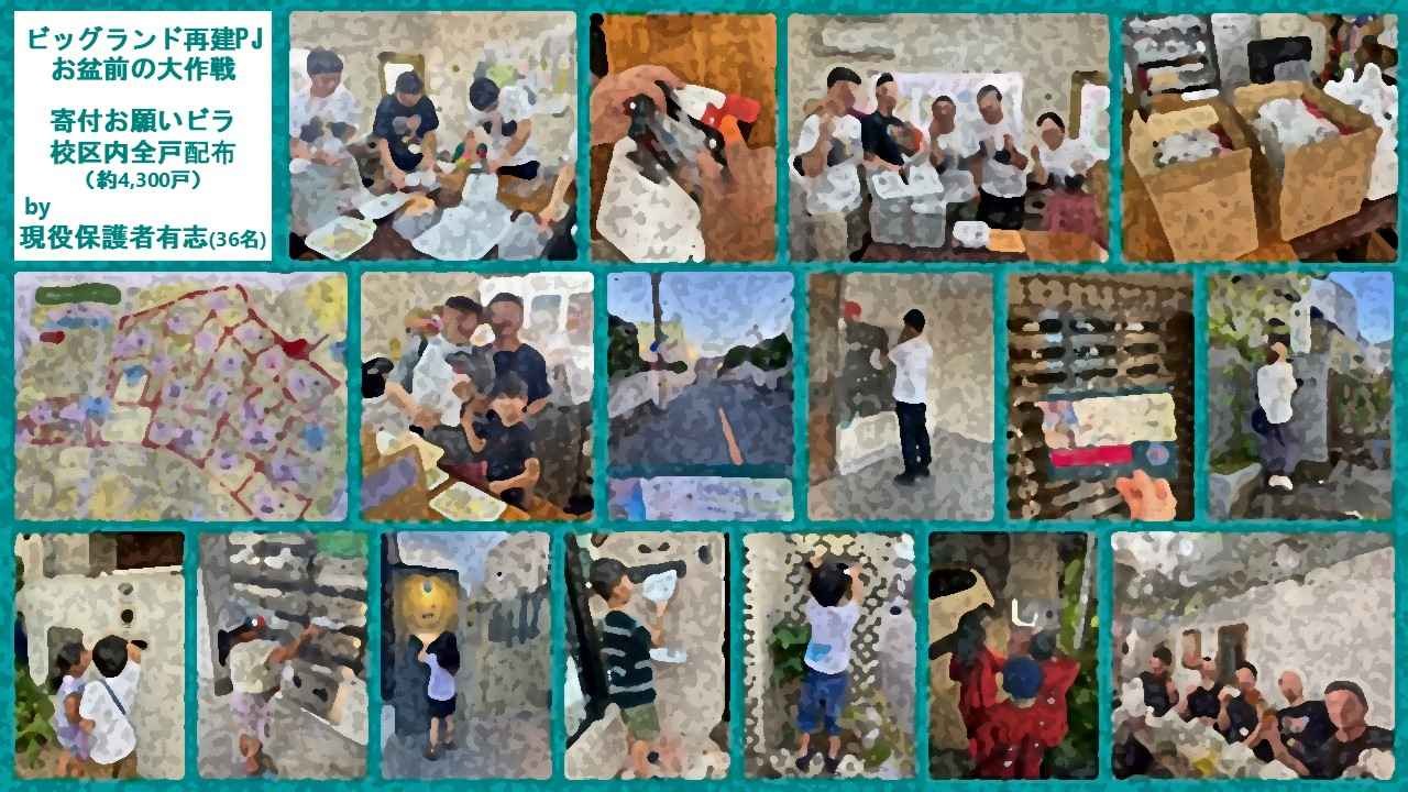 そこで、ふるさとを離れた卒業生がお盆休みに帰省されるタイミングに合わせ、小学校校区の全世帯(約4,300戸)にビッグランドのビラをポスティングする大作戦を企画しました。協力いただける有志を募ったところ、なんと36名もの現役保護者が集まってくださいました。皆で手分けをし、本日配布を完了しました。