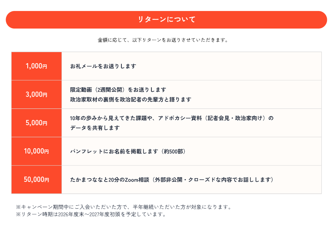 金額に応じて、以下リターンをお送りさせていただきます。