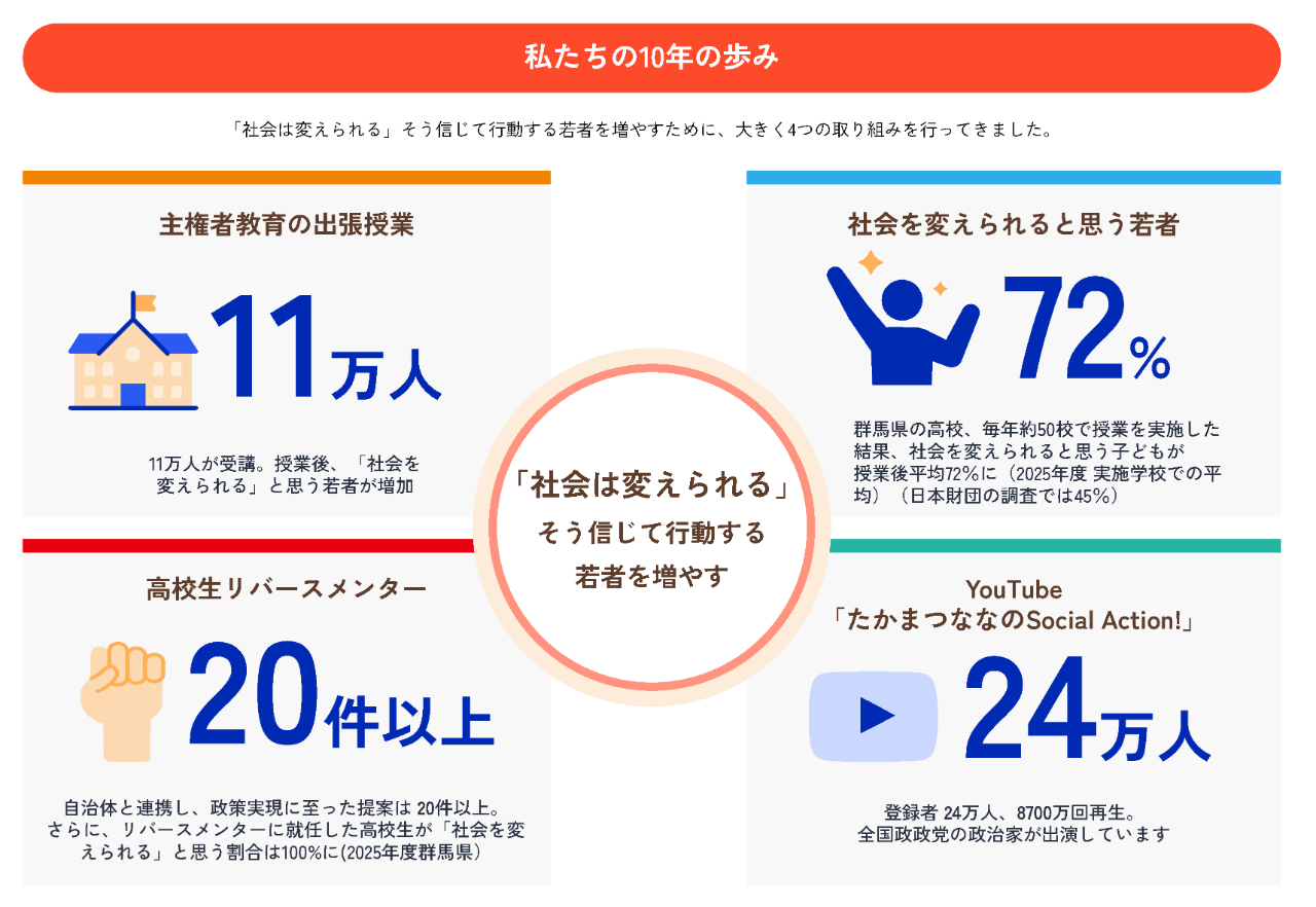 これまで、若者の政治参加を促進する主権者教育を11万人以上に届け、