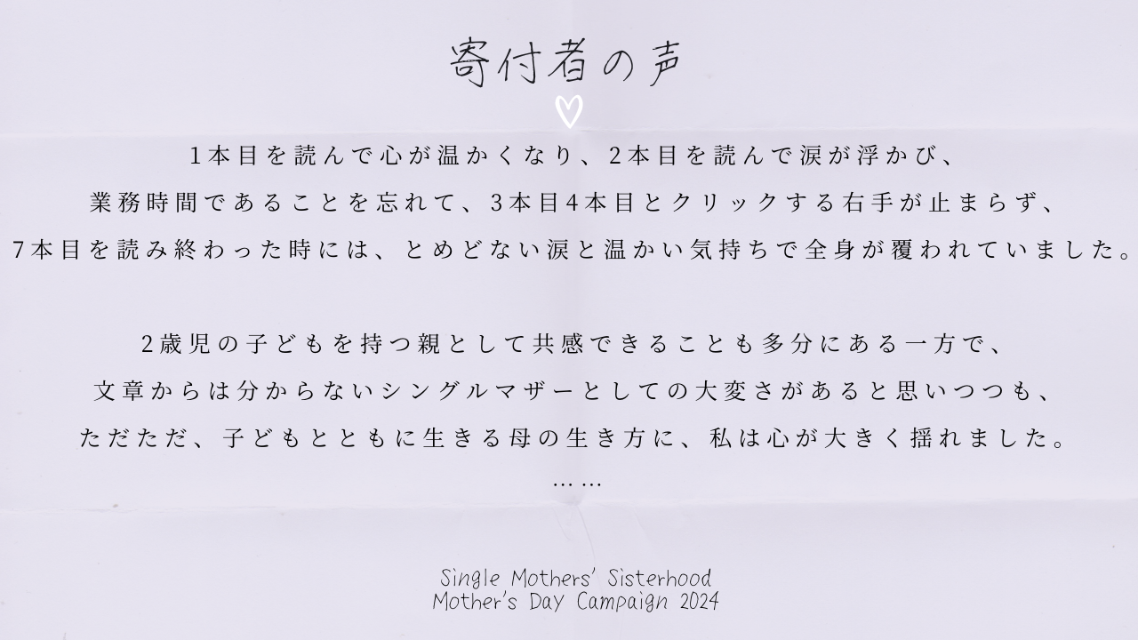 こんにちは、キャンペーンリーダーのサチコです。全国的に雨がちな日々も続きます、気がつけば母の日からもう一ヶ月経つのですね。今日も、エッセイへのうれしいご感想をご紹介します。
