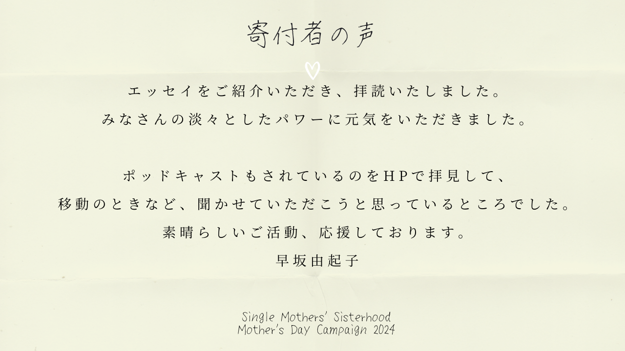 書き手であるシングルマザーの秘めた力を読み取ってださったようで、私はこの一言を、とても嬉しく感じました。