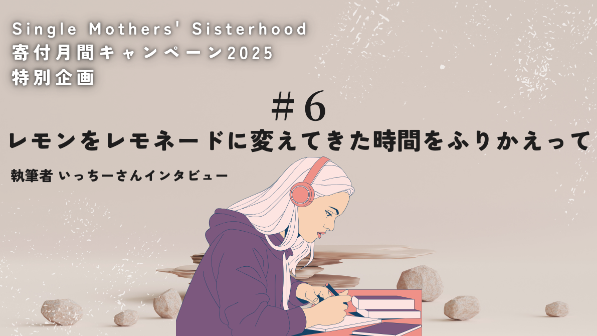 2025-12-06 10:12寄付月間2025インタビュー⑥公開『レモンをレモネードに変えてきた時間を振り返って』寄付月間2025がスタートしました!今年、シングルマザーズシスターフッドは5周年を迎えます。この節目の年にあたり、これまでエッセイを執筆してくれたシングルマザーたちを再訪し、彼女たちの「その後」に耳を傾けるスペシャルインタビューを実施しました。2025-12-06 10:12寄付月間2025インタビュー⑥公開『レモンをレモネードに変えてきた時間を振り返って』寄付月間2025がスタートしました!今年、シングルマザーズシスターフッドは5周年を迎えます。この節目の年にあたり、これまでエッセイを執筆してくれたシングルマザーたちを再訪し、彼女たちの「その後」に耳を傾けるスペシャルインタビューを実施しました。