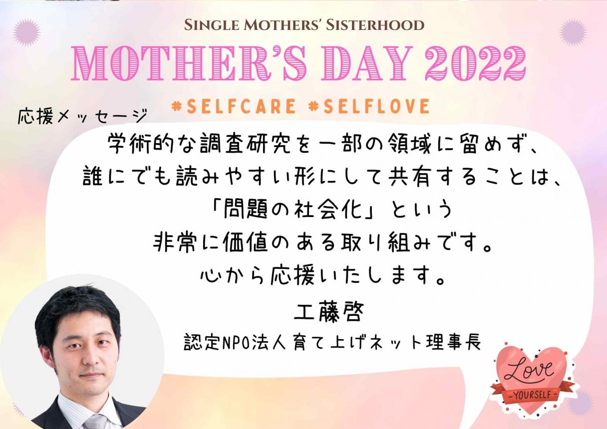 本日は認定NPO法人育て上げネットの理事長である工藤啓さんから応援メッセージをいただきました。工藤さんはじめ育て上げネットの皆さんとは、マイクロソフトのGSI-J(Global Skills Initiative-Japan)でご一緒しており、ITを活用した就労支援という文脈で、若者支援、シングルマザー支援ともに知見を交換しながら、刺激をいただいています。