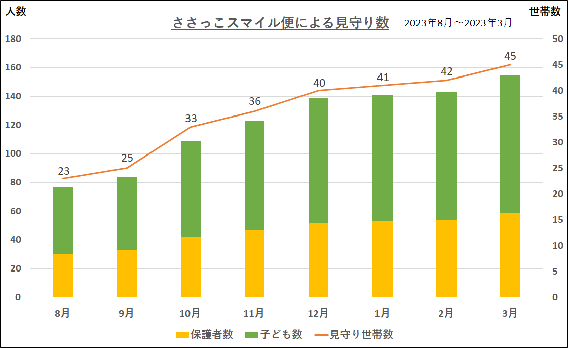私たちには、団体立ち上げ当初から「より困難を抱える子育て世帯をサポートしたい!」という想いがあり、昨年8月、見守りが必要な世帯に向けた子ども宅食事業『ささっこスマイル便』をようやくスタートしました。3月時点で45世帯(大人59人、子ども96人)を見守っています。