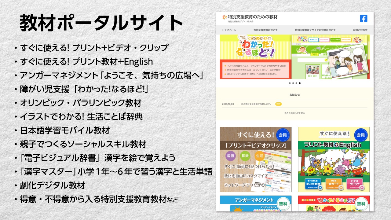 特別支援教育デザイン研究会は、新しい学びのスタイルとして特別支援教育の現場で役立つWEB教材や支援ツールの開発・提供を目的とした団体です。私たちは、2005年から特別な支援が必要な子どもたちがよりよい教育を受けられるよう、地域の指導者や保護者と連携して活動しています。多様なニーズに応えるために、最新のビジュアル理論、教育理論や技術を活用し、効果的な教材や支援方法を追求しています。