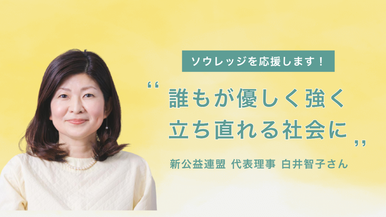 今回はソウレッジを応援してくださる1人、新公益連盟代表理事の白井智子さんから応援メッセージをいただきました!