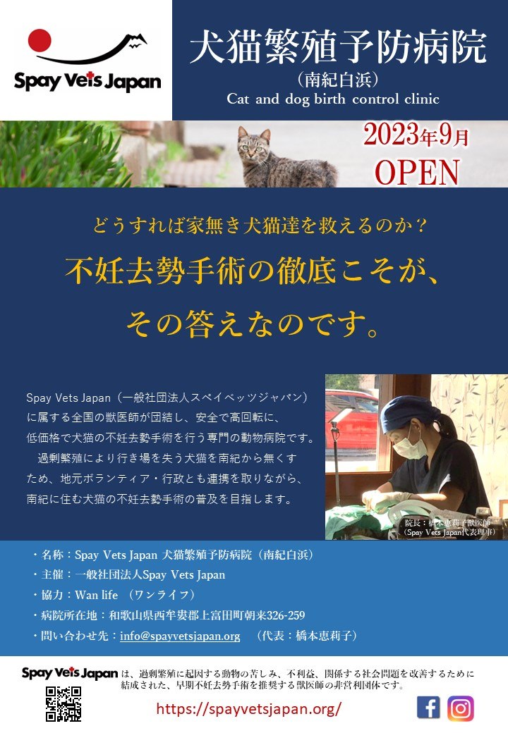 当会は、兼ねてから和歌山県南紀白浜を視察し、野良犬の過剰繁殖問題への取り組みの本格化および野良猫の不妊手術のさらなる浸透を目的とし、犬猫繁殖予防病院(Cat and dog birth control clinic)を開業する運びとなりました。当会の会員獣医師が団結し、安全で高回転に低価格で犬猫の不妊手術を行います。