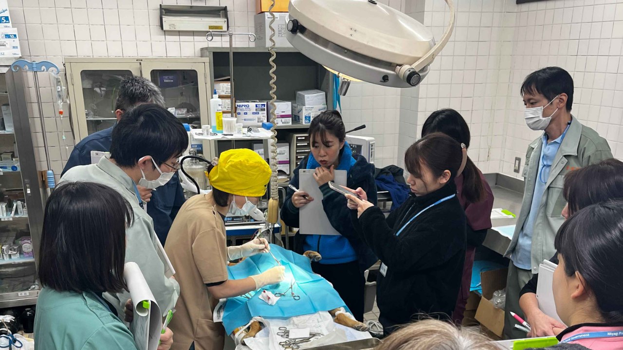 今回は大門獣医師の執刀で、成猫のオスとメス、成犬のオスとメス、さらに体重1kgちょっとの仔猫のメスの手術を実演し、その後意見交換会を実施いたしました。仔猫のオスの手術に関しては、保健所職員に実際に指導しながら去勢手術をやってもらいました。