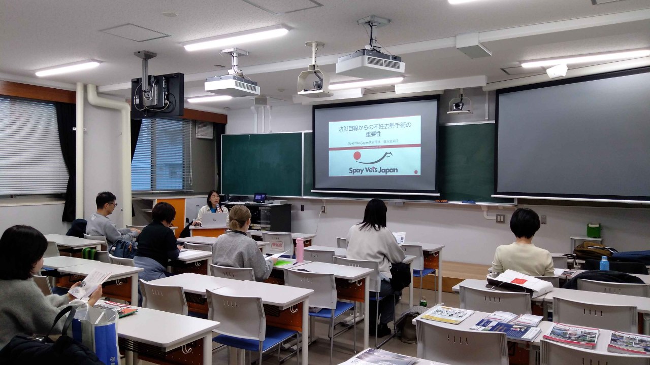 2025年1月15日。阪神淡路大震災から30年が経ったこの時期に、防災について考える講義を、岐阜大学応用生物科学部獣医内科学研究室の西飯教授のご協力で行いました。当会初めての大学での講義となります。橋本代表理事は、飼い犬猫に対して、日ごろの備えとして不妊去勢手術を行っていることで、避難所での発情の鳴き声、予定外の妊娠(被災動物を増やしてはいけない)、スプレー行動、喧嘩などの心配がなくなること。さらには、仮設住宅に入る際に不妊去勢手術が済んでいることが条件である市もあるので、スムーズに入居できることなどのメリットを述べました。震災が起こってからすぐには不妊去勢手術が受けられないことが殆どなので、無事に避難所へいくためにも平常時から不妊去勢手術を済ませておくことの重要性を講演しました。ご参加頂きました方々、ご協力くださいました西飯教授に感謝申し上げます。獣医学生へどんどん発信していきます。