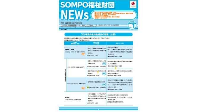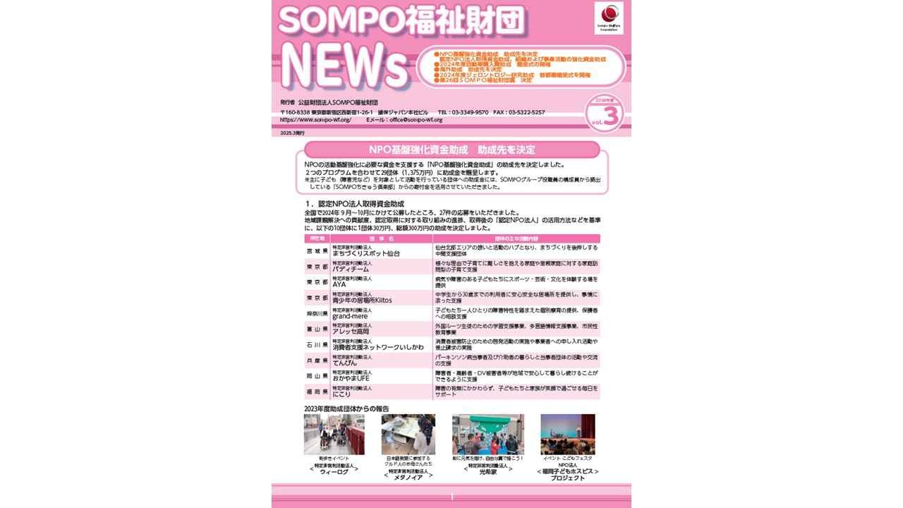 2025-06-18 13:24SOMPO福祉財団ニュース Vol.1を発行しました!●2025年度の主な助成金の募集(公募) ●2024年度 自動車購入費助成、NPO基盤強化資金助成 贈呈式を開催 ●2024年度 海外助成 贈呈式を開催 ●助成先からの活動報告 ●第26回SOMPO福祉財団賞 贈呈式を開催 ●財団からのお知らせ 詳細はこちら⇒file:///H:/Users/Z190007/Documents/ChromeTmp/2025_vol3.pdf2025-06-18 13:24SOMPO福祉財団ニュース Vol.1を発行しました!●2025年度の主な助成金の募集(公募) ●2024年度 自動車購入費助成、NPO基盤強化資金助成 贈呈式を開催 ●2024年度 海外助成 贈呈式を開催 ●助成先からの活動報告 ●第26回SOMPO福祉財団賞 贈呈式を開催 ●財団からのお知らせ 詳細はこちら⇒file:///H:/Users/Z190007/Documents/ChromeTmp/2025_vol3.pdf