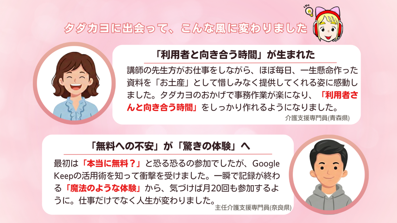 NPO法人タダカヨは、介護業界の未来のために、2020年に立ち上げた非営利団体です。私たちは全員が本業の合間を縫って、この活動に励んでおります。進化が著しいIT業界では、高機能でありながら「無料もしくは低コスト」で利用できる素晴らしいサービスが日々生まれています。ウェブ会議ツール、クラウド型記録ソフト、ビジネスチャット、勤怠管理ソフト……。これらは介護業務の効率化や、高齢者の皆様のQOL向上に直結する大きな可能性を秘めています。私たちは、これら「お金のかからないIT」を日本中に届けることで、