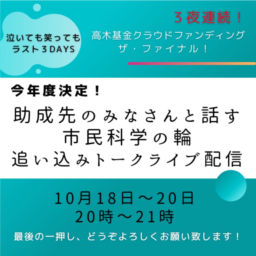 2022-10-17 21:23クラファン最後の3日間・連続トークライブやります!10月18日~20日の最後の3日間、夜8時~9時の時間に、2022年度の国内枠助成先の紹介を中心に、「追い込みトークライブ」を行います。2022-10-17 21:23クラファン最後の3日間・連続トークライブやります!10月18日~20日の最後の3日間、夜8時~9時の時間に、2022年度の国内枠助成先の紹介を中心に、「追い込みトークライブ」を行います。