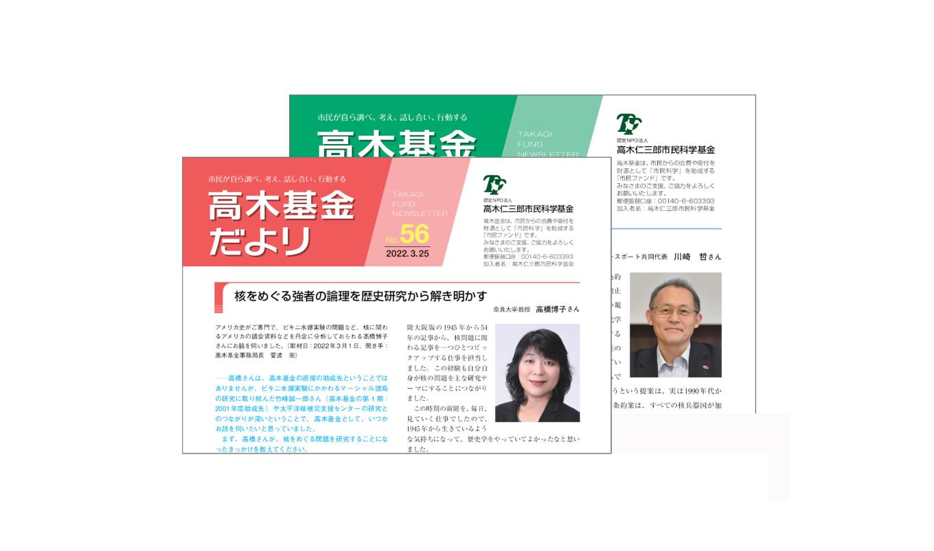 「高木基金だより」は、高木基金が、年3回、発行しているニュースレターです。様々な問題の現場で活躍する方への巻頭インタビューから、国内・アジア枠助成事業の紹介、調査研究の報告、高木基金の特別事業である原子力市民委員会の活動報告など、様々な情報をお届けしています。