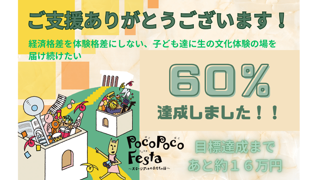 ご支援ありがとうございます!スタートから12日目、目標金額の60%【24万円】達成しました。 みなさまからのご支援、応援コメントに力をいただいてスタッフ一同目標達成にむけて走り続けます! ぽこぽこフェスタの継続を通して子ども達にとって身近な地域で体験機会を作り続けるため、引き続きみなさまのご支援、シェア拡散の応援をよろしくお願い申し上げます!