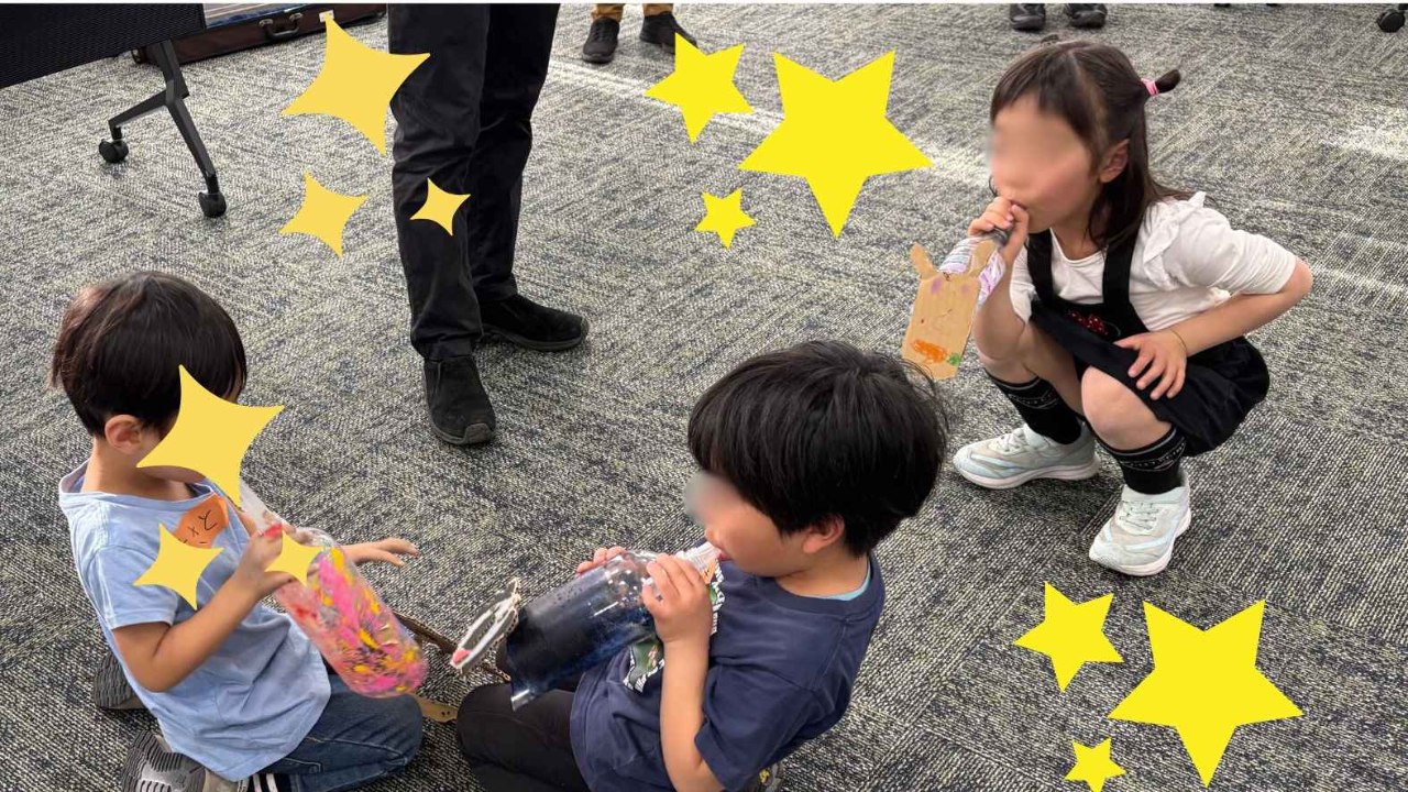 2025-06-20 10:00多摩子ども劇場の事業をご紹介します その2体験の続き、舞台鑑賞会では【事前遊びワークショップ】をすることがあります。事前や事後に取り組むことで参加者同士が交流し、より鑑賞当日を楽しみます。ひとみ座の「はれときどきぶた」の人形劇を観た後は自分たちもやってみようと、布やリボン、端切れ、毛糸でパペット人形を作って人形劇をして遊びました。ミニステージで人形になり切って自己紹介したり、大女優になって演じたり個性豊かな人形劇ごっこになりました。コンサートではアーティストと一緒に曲を作って歌ったり踊ったり。写真は、多摩子ども劇場40周年記念コンサート「ロバの音楽座スペシャル」の事前ワークショップの様子です。ロバの音楽座の松本雅隆さんと一緒に「世界に2つとない空想楽器ブーパク作り」をしました。魔法が掛かると「ブーパク」が歌いだします。公演では、ワークショップ参加者もステージにあがり、ブーパクでロバの音楽座と一緒に演奏をしました。2025-06-20 10:00多摩子ども劇場の事業をご紹介します その2体験の続き、舞台鑑賞会では【事前遊びワークショップ】をすることがあります。事前や事後に取り組むことで参加者同士が交流し、より鑑賞当日を楽しみます。ひとみ座の「はれときどきぶた」の人形劇を観た後は自分たちもやってみようと、布やリボン、端切れ、毛糸でパペット人形を作って人形劇をして遊びました。ミニステージで人形になり切って自己紹介したり、大女優になって演じたり個性豊かな人形劇ごっこになりました。コンサートではアーティストと一緒に曲を作って歌ったり踊ったり。写真は、多摩子ども劇場40周年記念コンサート「ロバの音楽座スペシャル」の事前ワークショップの様子です。ロバの音楽座の松本雅隆さんと一緒に「世界に2つとない空想楽器ブーパク作り」をしました。魔法が掛かると「ブーパク」が歌いだします。公演では、ワークショップ参加者もステージにあがり、ブーパクでロバの音楽座と一緒に演奏をしました。