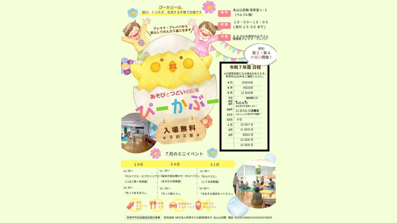 乳幼児の親子が安心してくつろいだり、遊んだりできる交流の場を作ることを目的に、【あそびとつどいの広場「ぴーかぶー」」 】を多摩市民協働指定委託事業として毎月2回、永山公民館の保育室で開催しています。お昼寝しない赤ちゃんをベビーカーに乗せてお散歩がてら寄ってみたり、里帰り出産をするお嬢さんとそのお孫さんのためにおばあちゃまがいらしたり、いろいろな方が参加しやすい広場です。また、季節にあわせた簡単な工作は親子で楽しむことができます。公民館からのお声かけで保育園の先生がきてくださるミニイベントでは、楽しい遊びやわらべうたなどをしていただきますが、参加する保護者にとっては保育園の情報を得られる機会にもなっています。夏は、屋上に大きなビニールプールを設置、ふだんは入ることのできない屋上ではじめてのプール遊びを楽しみます。公民館との協働ですすめている事業です。