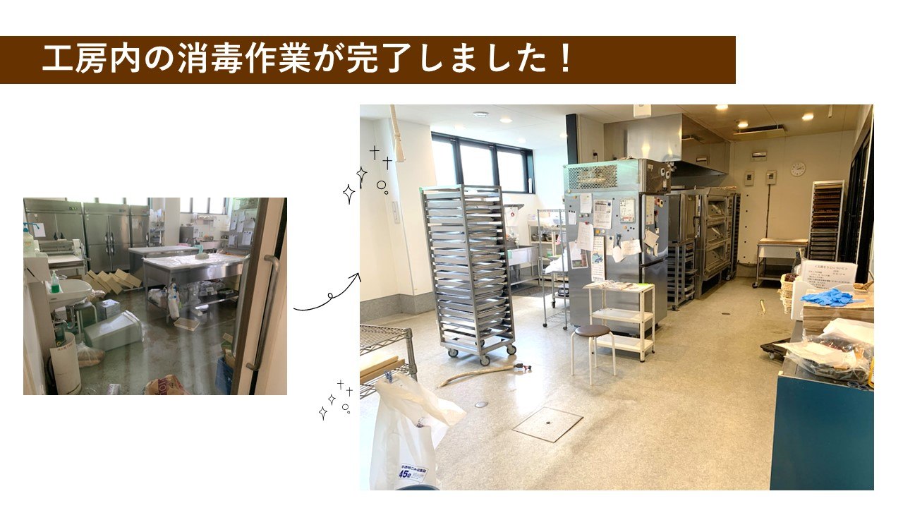 2023-06-20 15:05消毒作業完了!!クラウドファンディングに挑戦中も、利用者職員、一丸となって、お店をスタートするための作業にあたっています。昨日、消毒作業や、ショートしてしまった電気設備の修理も完了しました。今週新しい冷凍・冷蔵庫が入り次第、製造を再開し、クラウドファンディングでご購入いただいたパンの郵送準備にとりかかります。 忙しくなりますが、「働けるって嬉しい!」喜びを感じながら、みんなで取り組んでいきたいと思います。 ありがとうございました!引き続きよろしくお願いいたします。2023-06-20 15:05消毒作業完了!!クラウドファンディングに挑戦中も、利用者職員、一丸となって、お店をスタートするための作業にあたっています。昨日、消毒作業や、ショートしてしまった電気設備の修理も完了しました。今週新しい冷凍・冷蔵庫が入り次第、製造を再開し、クラウドファンディングでご購入いただいたパンの郵送準備にとりかかります。 忙しくなりますが、「働けるって嬉しい!」喜びを感じながら、みんなで取り組んでいきたいと思います。 ありがとうございました!引き続きよろしくお願いいたします。
