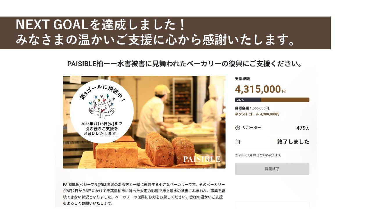 PAISIBLE(ペジーブル)柏は障害のある方と一緒に運営する小さなベーカリーです。そのベーカリーが6月2日から3日にかけて千葉県柏市に降った大雨の影響で床上浸水の被害にみまわれ、事業を継続できない状況となりました。ベーカリーの復興にお力をお貸しください。皆様の温かいご支援をよろしくお願いいたします。